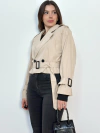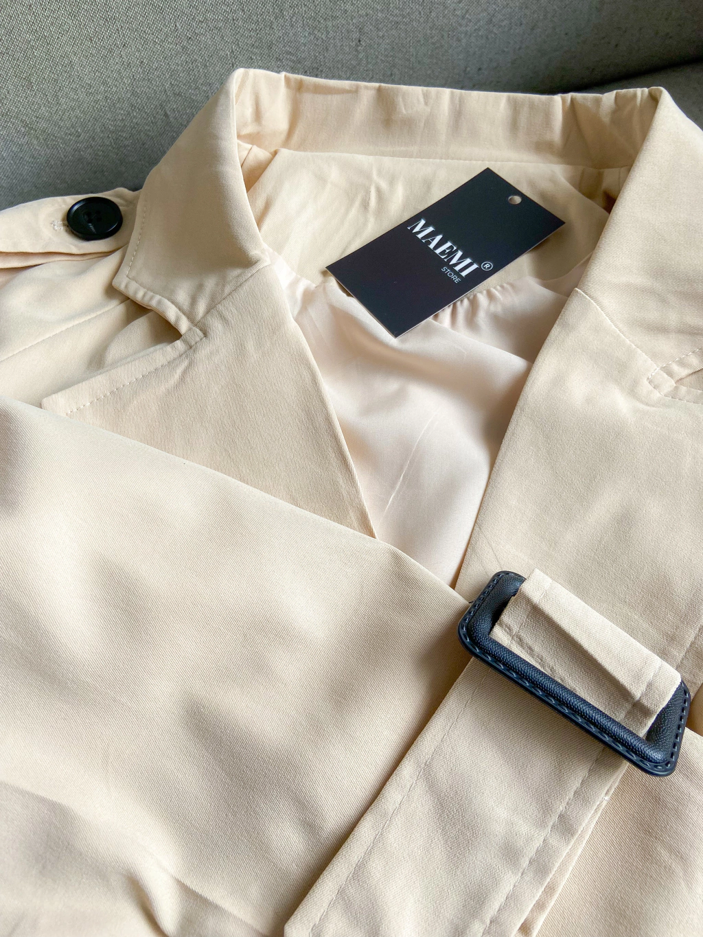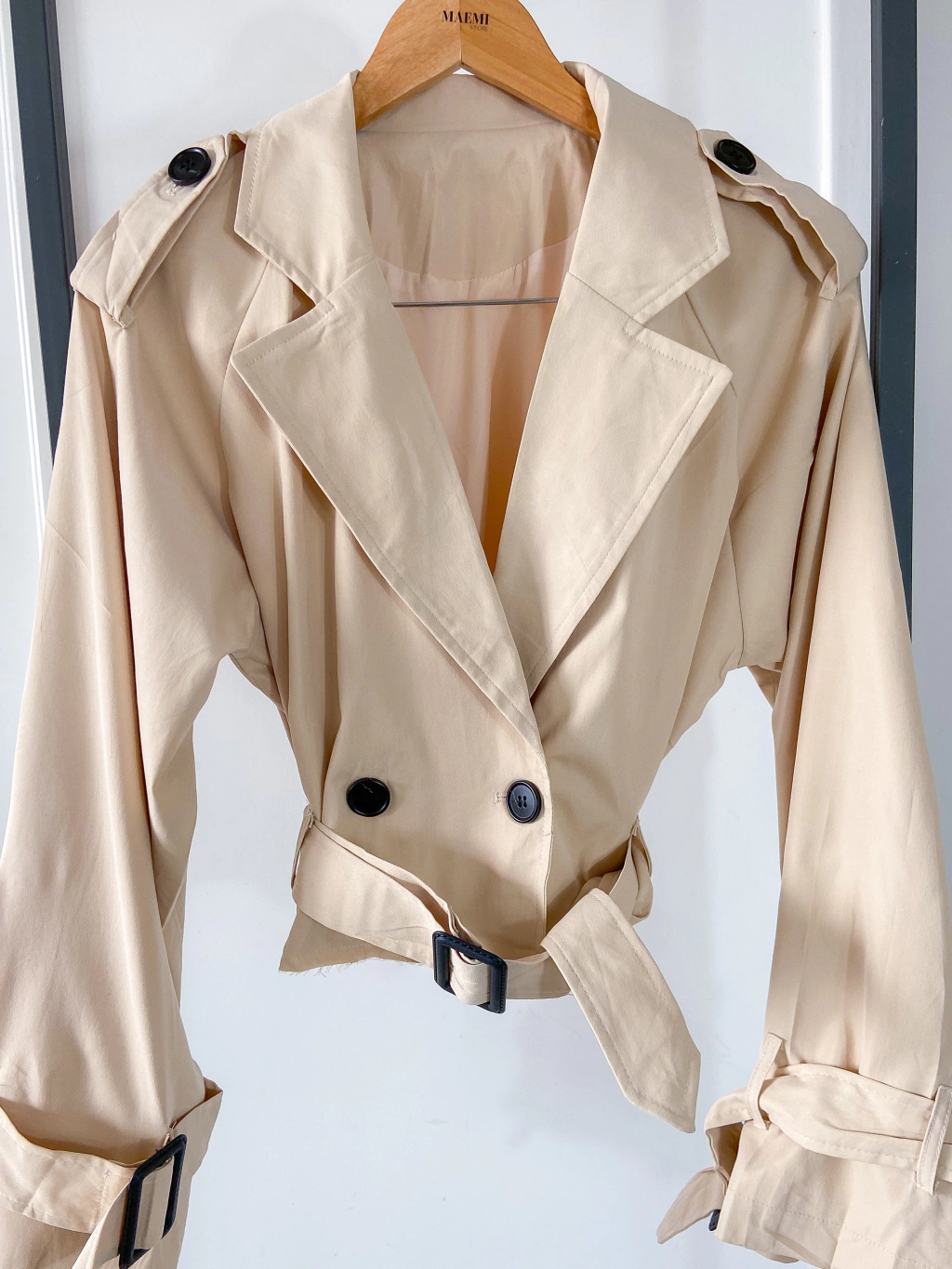 Modelagem ampla ajustável com faixa, comprimento curto, fechamento frontal com dois botões, faixa e fivela removíveis nos punhos e cintura, detalhes decorativos nos ombros, forro para maior conforto. Acabamento levemente desfiado na barra. Tecido de leve gramatura, indicado para dias mais amenos ou para compor looks com camadas, já que possui uma modelagem mais ampla.