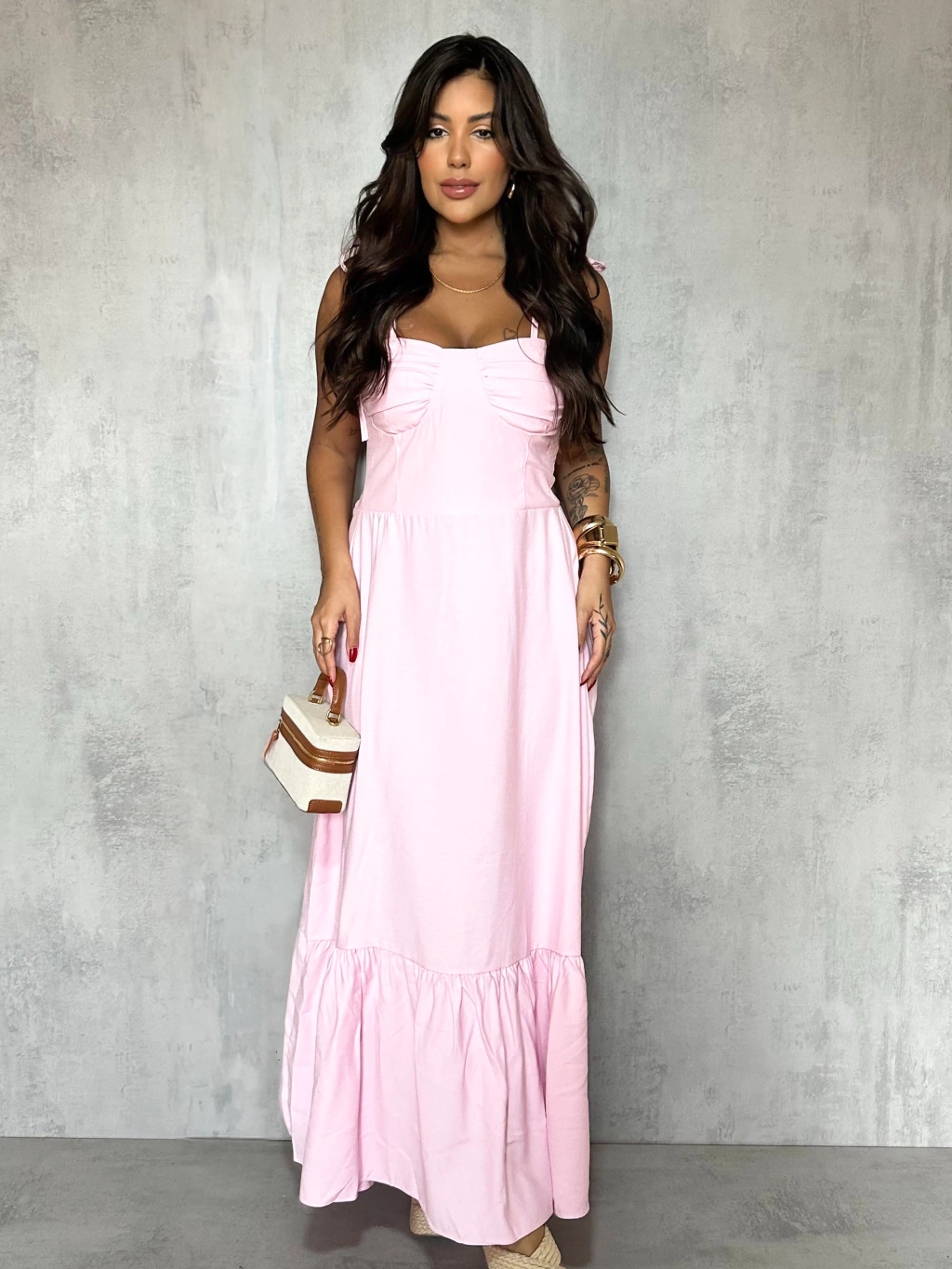 Vestido em tecido plano de alta gramatura - sem transparência, busto estruturado com leve drapeado, alças finas com amarração, parte inferior mais solta, costas com elastex para conforto e melhor sustentação. Comprimento longuete